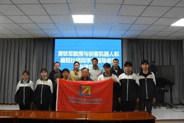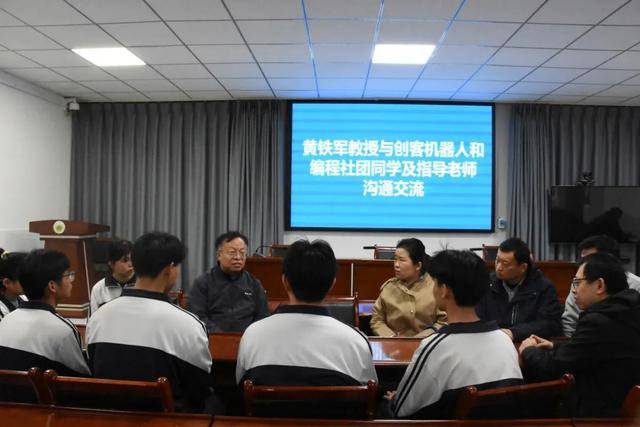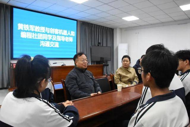 黄铁军传授取我校创客机械人团队、航模团队、编程团队的员及部门学生进行了沟通交换,