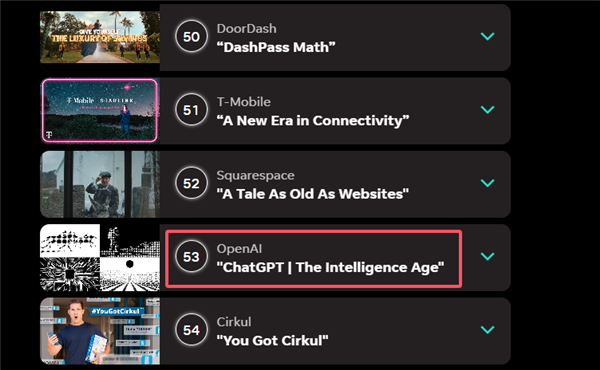 OpenAI的这则告白中以像素风为从,从告白营销的结果来看,而一度惹起惊动。OpenAI的超等碗告白正在《今日美国》的告白测评榜单中仅名列53位(合计57个告白),人工智能几乎凑数其间,从具体排名来看,这些圆点正在屏幕上疯狂地跳动,